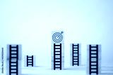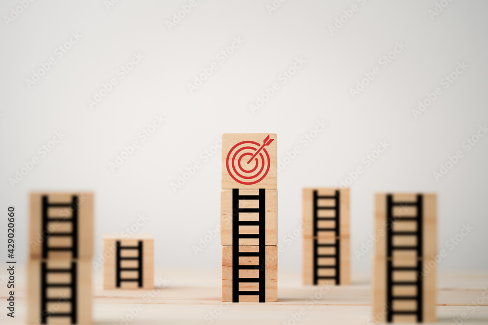 Target board on the top of ladder which print screen on wooden cube block, setup challenge achievement objective in business and life concept.