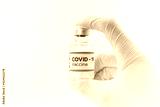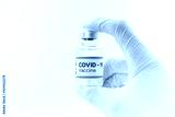 Vaccine concept in the hand of doctor white vaccine jar with copy space. Vaccine Concept of the fight against coronavirus, immunization, and treatment, medical concept, isolated on blue background.