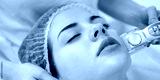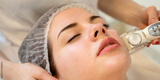 Close up of woman face, lying down in spa salon and have face cleaning procedure.