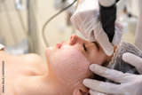 Calm young woman is getting anti-aging rejuvenation procedure at beauty salon. Beautician hands holding tool under her face.