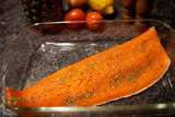 Raw Atlantic Salmon Fish Fillet Seasoned in Baking Dish Ready to Cook