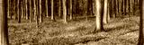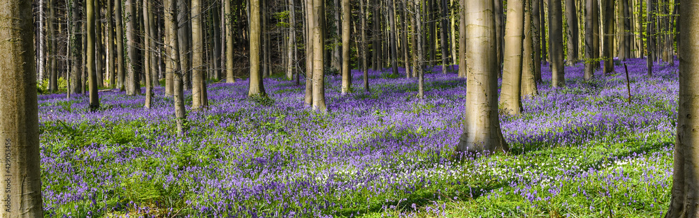 Beautiful panoramic landscape with purple flower carpet of wild bluebells in the forest of Belgium.