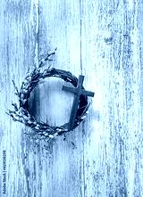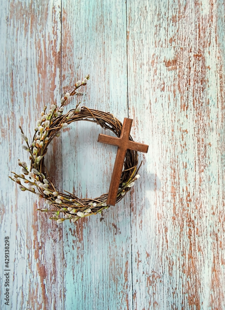 wreath of pussy willow twigs with buds and christianity cross on wooden rustic background. festive spring season concept. palm (willow) sunday orthodox holiday. flat lay