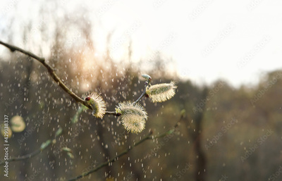 Beautiful fluffy willow buds close up. blossom pussy willow branch, Spring season natural background.