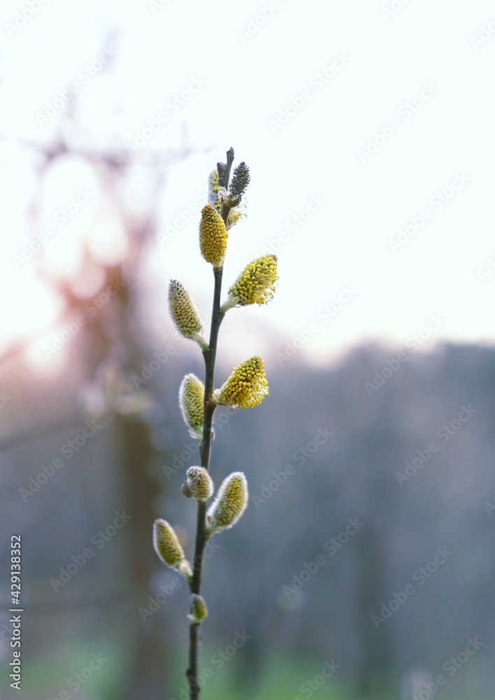 Beautiful fluffy willow buds close up. blossom pussy willow branch, Spring season natural background.