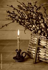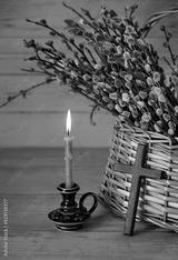 Burning candle, cross and willow branches in wicker bascet. Orthodox palm Sunday holiday, Easter, festive spring season. symbol of faith and prayer