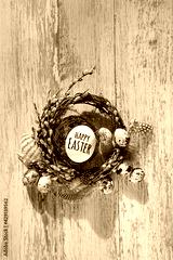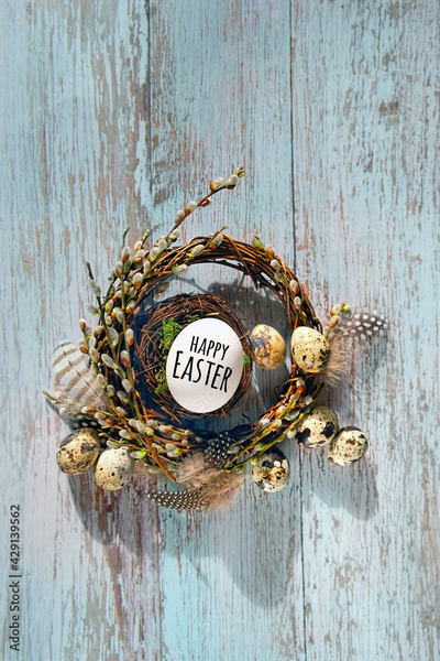 Happy Easter. willow wreath and eggs on wooden rustic background. festive spring season concept. Easter orthodox holiday. flat lay