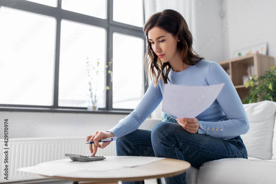 accounting, taxes and finances concept - young woman with papers and calculator at home