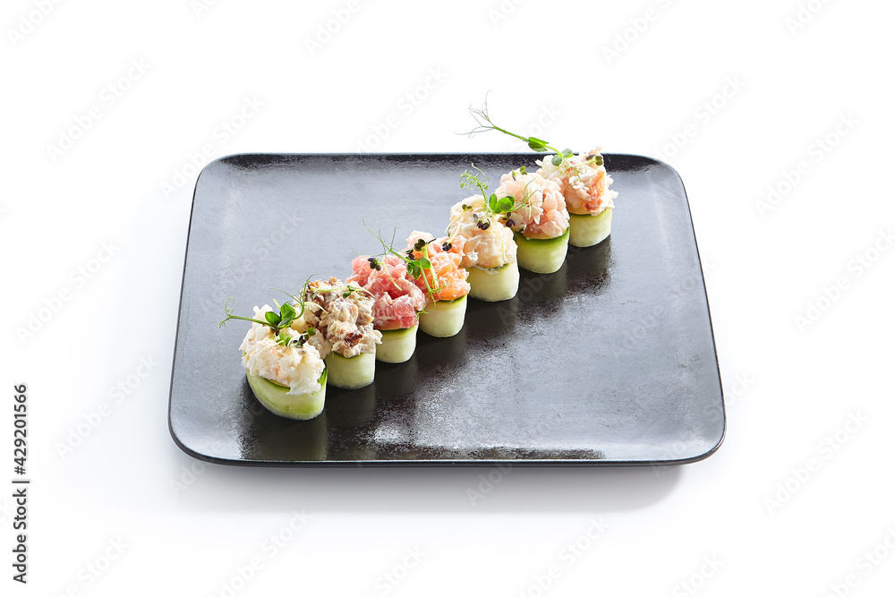 Cucumber wrapped sushi - Gunkan Maki Sushi with Seafood and sliced cucumber wrap around. Delicious Gunkan Sushi on black slate plate. Isolated on white background.