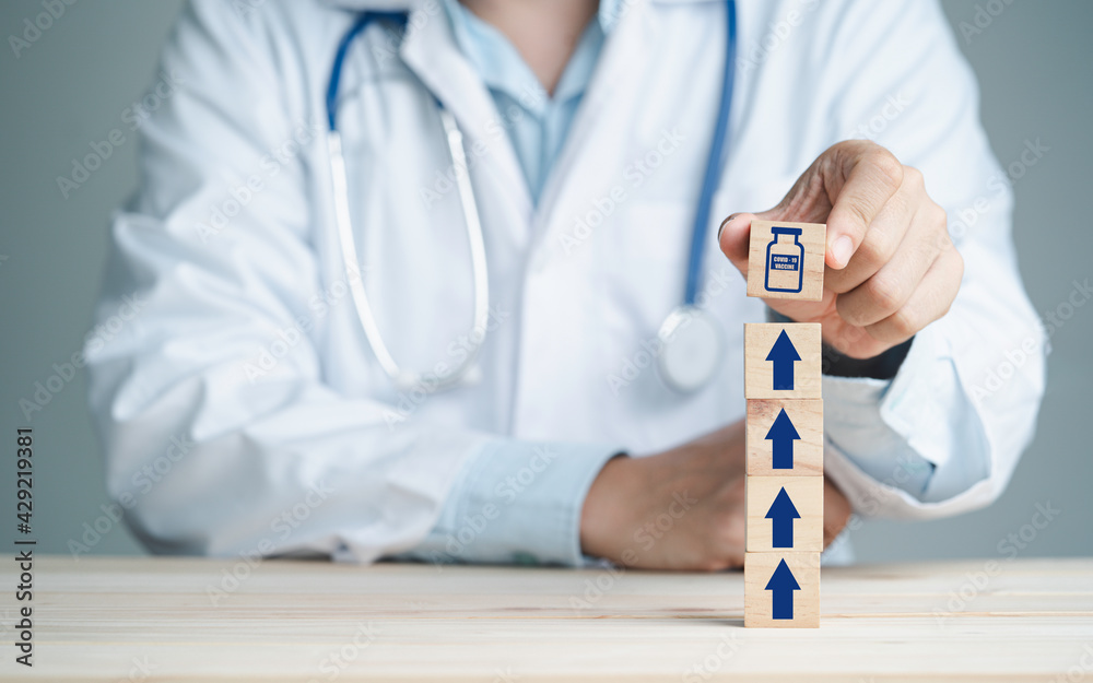 Doctor hand holding wooden stacking with covid-19 vaccine icon and up arrow for hurry up distribute and injection, Health and insurance concept.