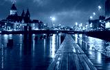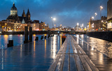 Bench on Pier/ Dock and Historic Church of Saint Nicholas (Basiliek van de Heilige Nicolaas) in background at dusk - Amsterdam, Netherlands