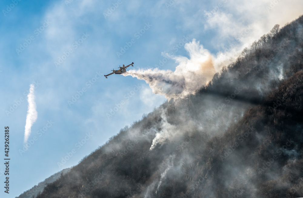 Firefighting Aircraft dropping the water for fighting a fire on mountain above Lake Ghirla in Valganna, province of Varese, Italy