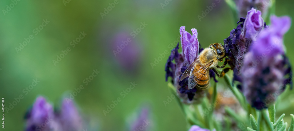 Honey bee pollinates lavender flower. Close-up and selective focus.