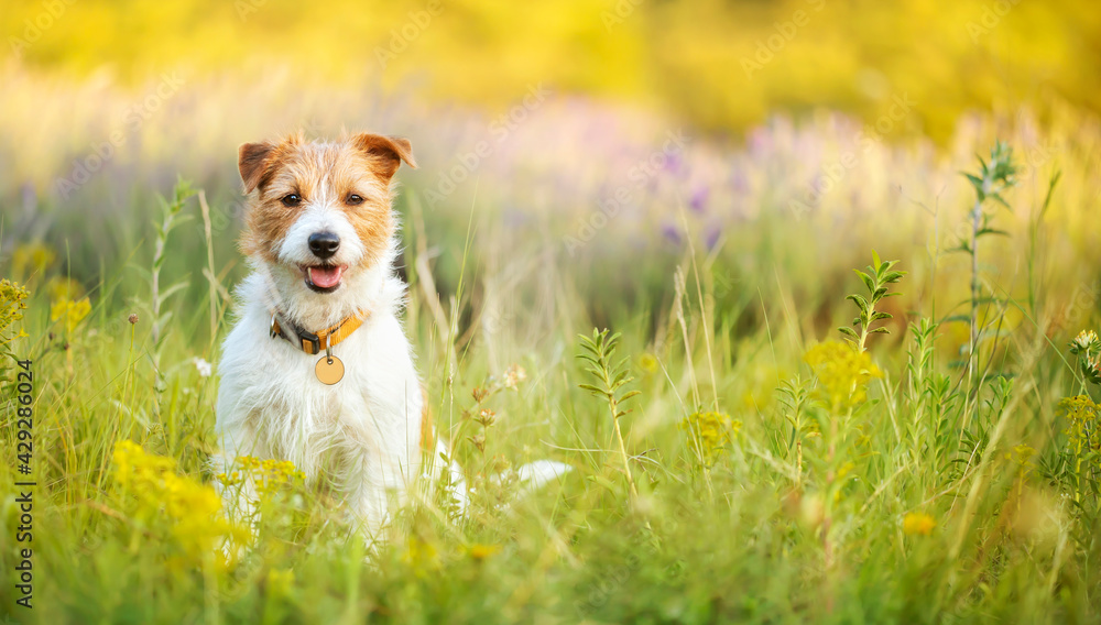 Banner of a happy cute pet dog puppy as sitting and listening ears in a meadow grass, flower herb field in summer.