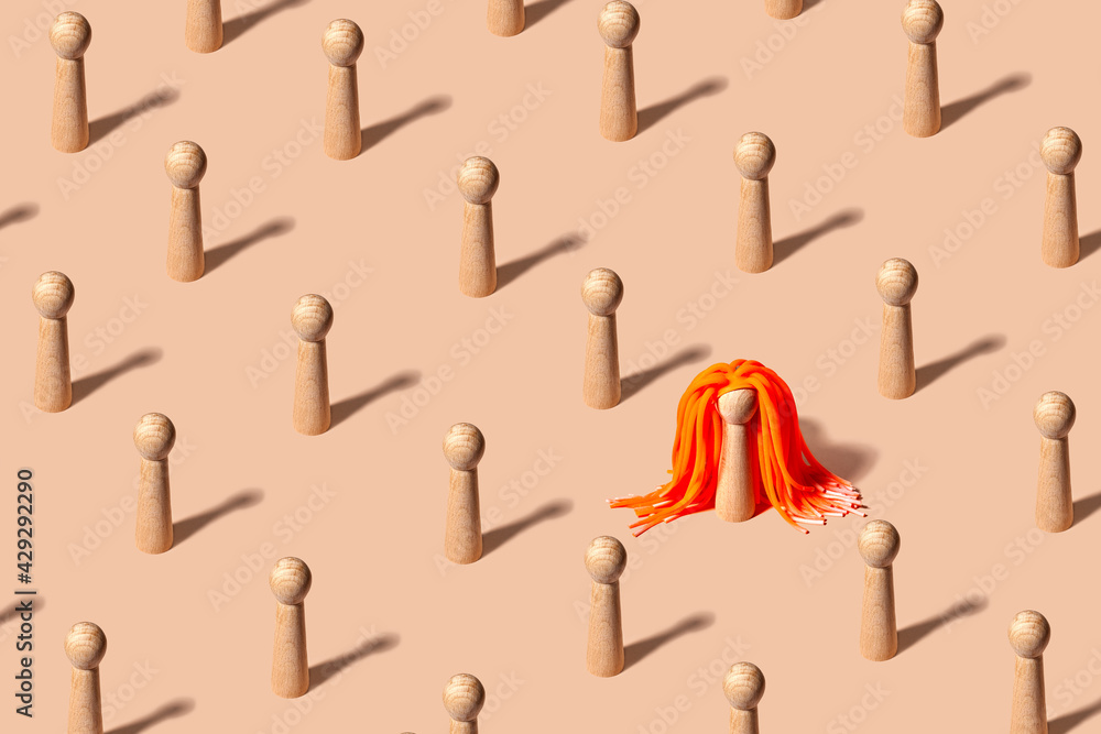 Creative pattern with equal figures representing people, one standing out with striking orange hair - concept of diversity