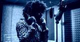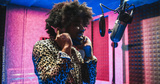 African american singer recording new music album inside boutique studio - Main focus on silver microphone