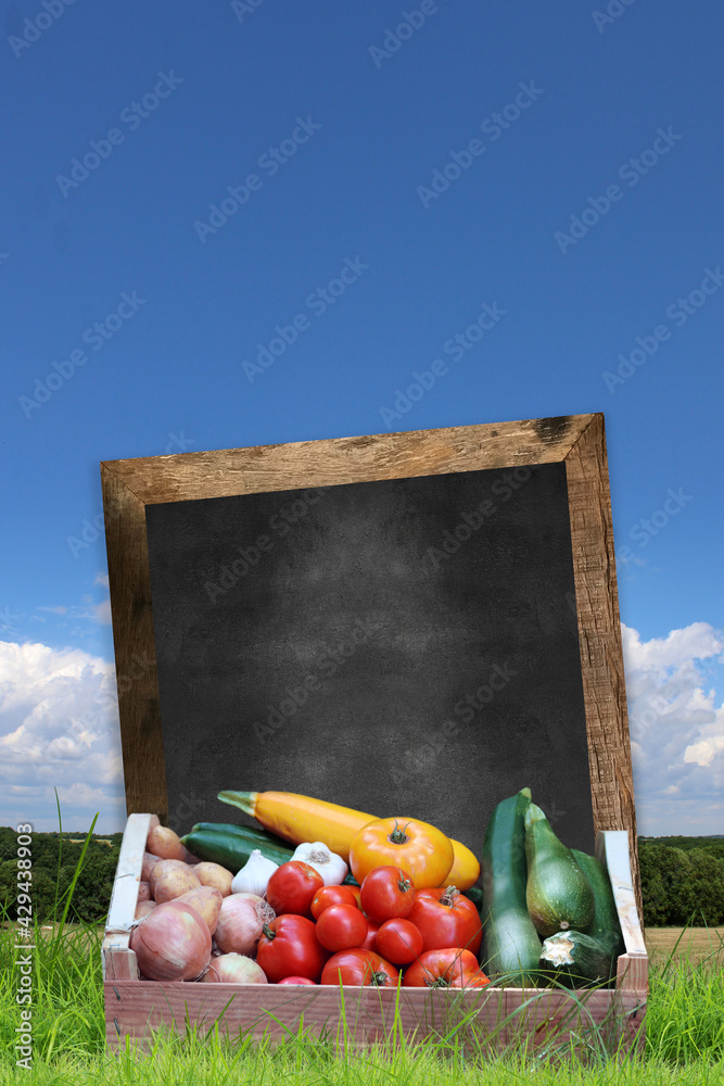 Plateau de légumes bio : tomates, courgettes, oignons...