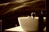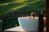 Woman in outdoor bath watching sunset