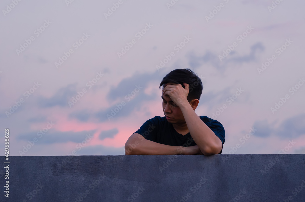 Asian miserable depressed man stay alone with sky background. Depression and mental health concept.