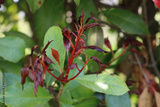 Photinia new leaves on bush damaged by frost on early springtime. Photinia x fraseri