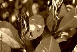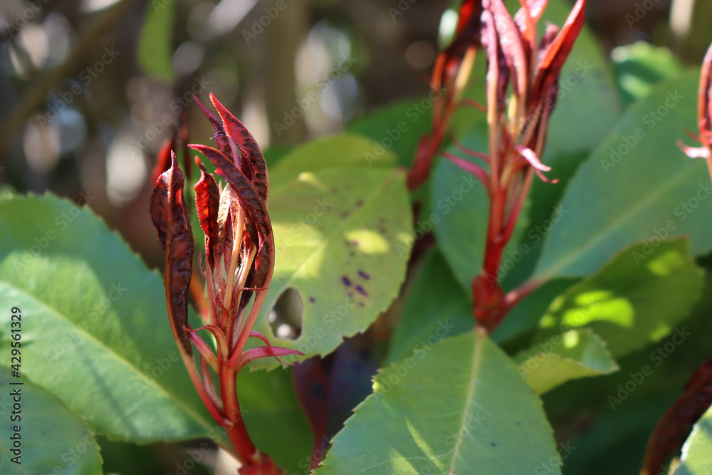 Photinia new leaves on bush damaged by frost on early springtime. Photinia x fraseri