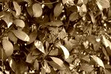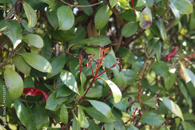 Photinia new leaves on bush damaged by frost on early springtime. Photinia x fraseri
