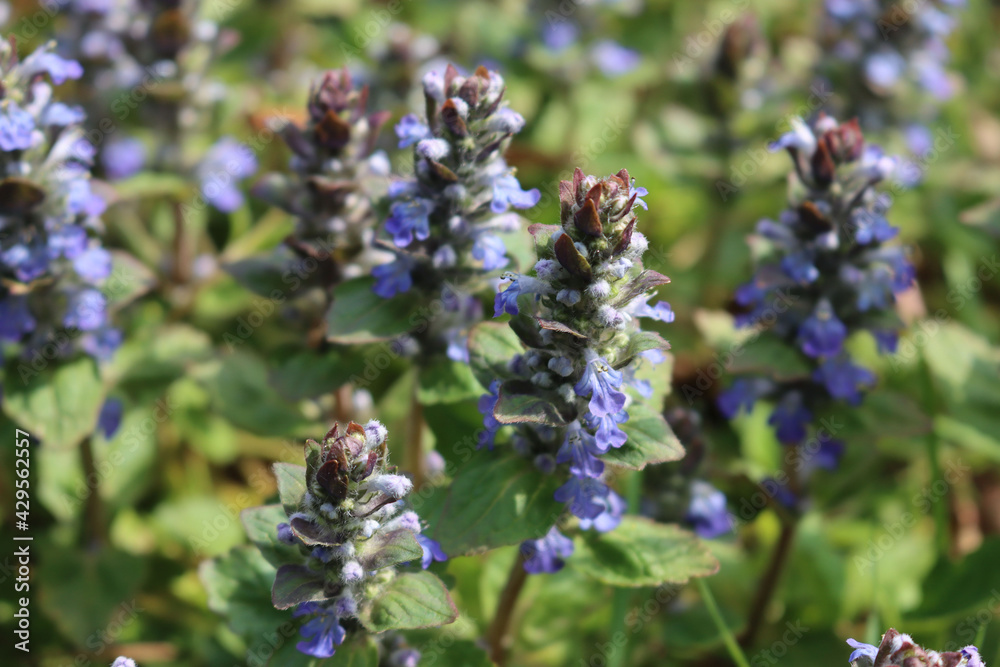 Carpet bugle blue flowers in the meadow on springtime,. Ajuga reptans plants in bloom