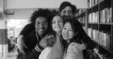 Portrait of happy multiethnic young people posing at camera in school library