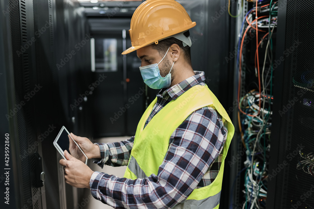 Young engineer man working inside data center center room while wearing safety mask - Focus on man face