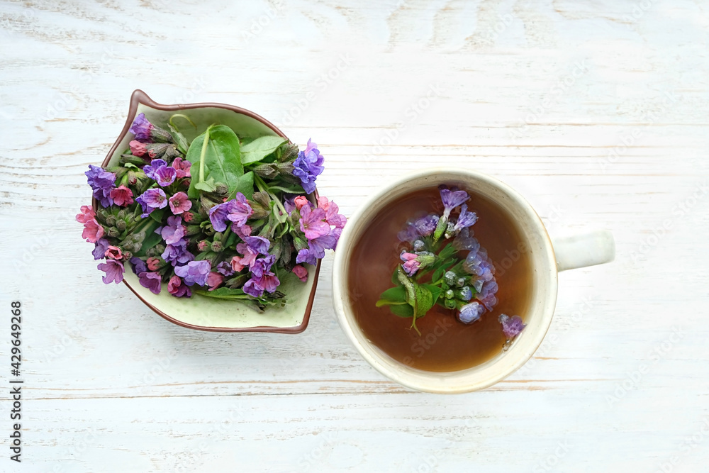 cup of healthy lungwort tea with fresh flowers on table. Medicinal infusion of early wild spring flowers Suffolk lungwort (Pulmonaria obscura). flat lay