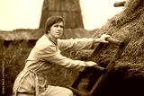 Downshifting concept. A young guy in national clothes lives in an eco-village and earns money from it