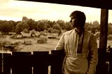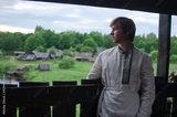 Downshifting concept. A young guy in national clothes lives in an eco-village and earns money from it