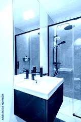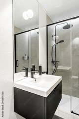 Clean bright bathroom interior with black matte faucet and shower. Original designed space with modern pieces and furniture