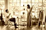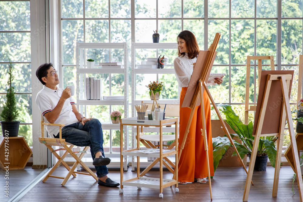 .Senior woman artist painting image in studio at home with green small tree in little garden and full of natural light. Her older husband sitting and drinking coffee and watching for her work