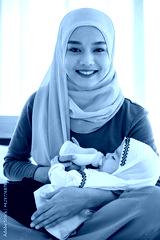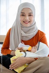A cute and beautiful Asian Muslim mother sitting on bed and holding sleeping infant daughter in her arms and feeding her the mild in bottle
