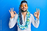 Young hispanic businessman wearing party funny style with tie on head relax and smiling with eyes closed doing meditation gesture with fingers. yoga concept.