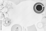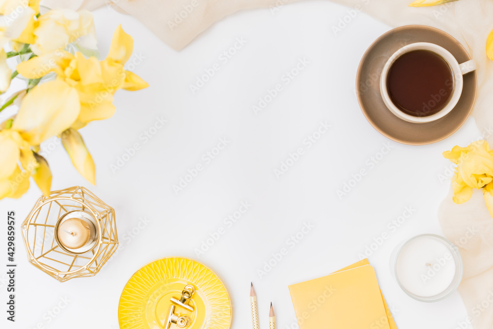 Flat lay home office desktop with notebook, yellow irises, cup with coffee on a white background
