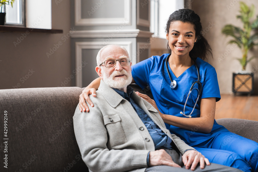 Front view portrait of caring afro nurse taking care of an elderly caucasian man grandfather grandpa indoors. Happy female doctor consulting old man in clinic.