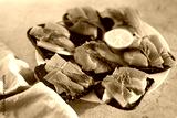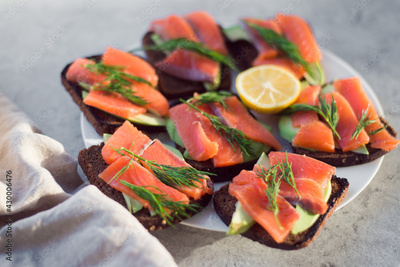 healthy snack - salmon avocado toasts with lemon and dill on dish
