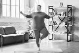Obese young fat woman standing in yoga position at home. Chubby overweight young caucasian woman practicing fitness for losing weight and burning calories