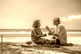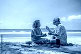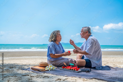 Happy Asian family on beach vacation. Senior couple sitting on blanket have picnic together on sea beach. Healthy elderly husband and wife relax and enjoy outdoor lifestyle activity on summer vacation