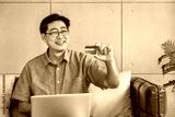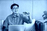 Senior Asian man sitting on sofa using laptop computer holding credit card for online shopping and payment