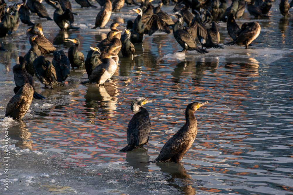 Waterfowl on the ice of a frozen river