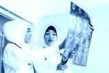 Muslim asian woman doctor wearing uniform with stethoscope looking at chest x-ray film photo of patient with lung pneumonia.healthcare and medicine