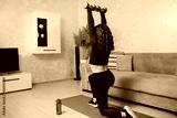 Young sporty woman holding dumbbells and raising her arms up while doing lunges exercises on a fitness mat at home.