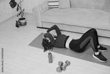 Tired sportswoman lying on the yoga mat on the floor at home after sport. She relaxing after workout training exercises at home.