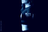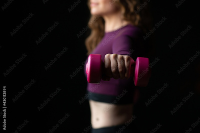 Slim athletic woman on black background in gym. She holding dumbbell in the hand. Close up.