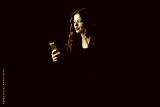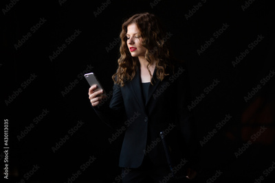 Portrait of a young businessman in a black suit with curly hair and red lips is using a smartphone, isolated on a black background with copy space.