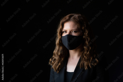 Closeup photo of businesswoman is ready for work in quarantine time, she using protective mask and standing isolated on black background.