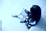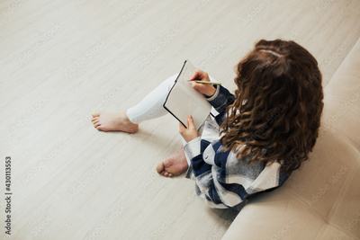 Woman with curly hair writing down plans on the future in the daily notebook while sitting near the sofa on the floor in the living room.